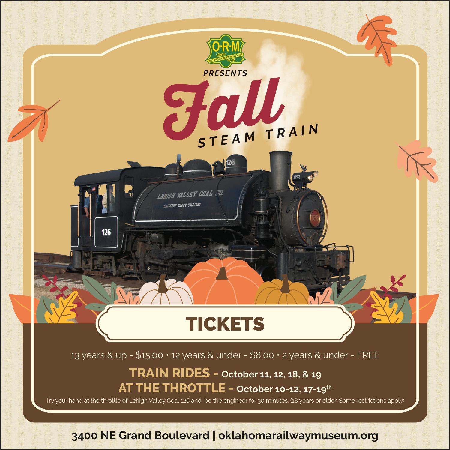 Tickets are $15.00 for adults, $8.00 ages three to twelve and under three ride free as a lap child Trains board at our historic Oakwood Depot on the Oklahoma Railway Museum grounds at: Saturdays 10:30 am, 12:15 pm, 1:45pm, and 3:15 pm