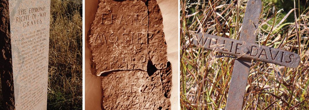 Frank Mosier’s red sandstone marker reads: “Frank Mosier, Died Sept. 17, 1886, Age 22.” The other grave is marked with an iron cross, fashioned by a blacksmith, reading simply “Willie Davis.” This iron cross was apparently erected by the brother of Willie Davis, who was believed to be a Catholic priest from Belgium. The cross was placed for Davis years after the fight and consequent burial occurred, when Edmond was a young town.