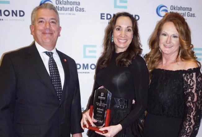 Busineses and individuals will be honored next February at the next Edmond Chamber awards banquet. Earlier this year Bespoke Vision was honored. On hand for the honor were, from left, Glen McCall, First United Bank – award sponsor; Selina McGee, Bespoke Vision – 2021 Small Business of the Year Award recipient; and Sherry Jordan – Edmond Chamber of Commerce CEO.
