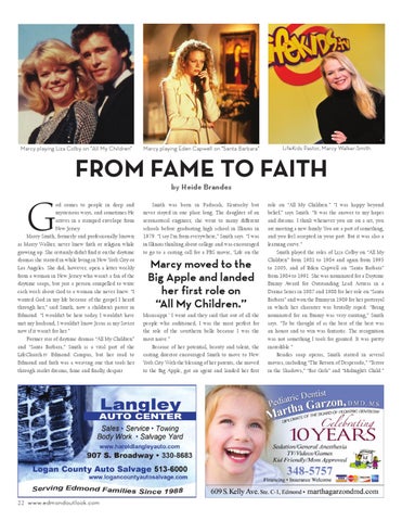 od comes to people in deep and mysterious ways, and sometimes He arrives in a stamped envelope from New Jersey. Marcy Smith, formerly and professionally known as Marcy Walker, never knew faith or religion while growing up. She certainly didn’t find it on the daytime dramas she starred in while living in New York City or Los Angeles. She did, however, open a letter weekly from a woman in New Jersey who wasn’t a fan of the daytime soaps, but just a person compelled to write each week about God to a woman she never knew. “I wanted God in my life because of the gospel I heard through her,” said Smith, now a children’s pastor in Edmond. “I wouldn’t be here today, I wouldn’t have met my husband, I wouldn’t know Jesus as my Savior now if it wasn’t for her.” Former star of daytime dramas “All My Children” and “Santa Barbara,” Smith is a vital part of the LifeChurch.tv Edmond Campus, but her road to Edmond and faith was a weaving one that took her through starlet dreams, fame and finally, despair.