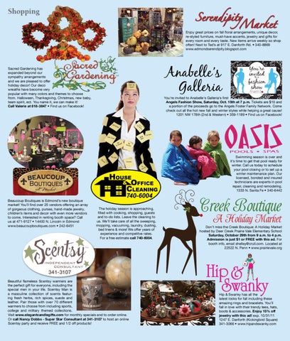 Swimming season is over and it's time to get that pool ready for winter. Call us today to schedule your pool closing or to set up a winter maintenance plan. Our licensed, bonded and insured technicians are experts in pool repair, cleaning and remodeling. 1333 N. Santa Fe • 340-6442 Beaucoup Boutiques is Edmond’s new boutique market! You’ll find over 25 vendors offering an array of gorgeous clothing, purses, hand-made jewelry, children’s items and decor with even more vendors to come. Interested in renting booth space? Call us at 471-9127 • 14400 N. Lincoln in Edmond www.beaucoupboutiques.com • 242-6451