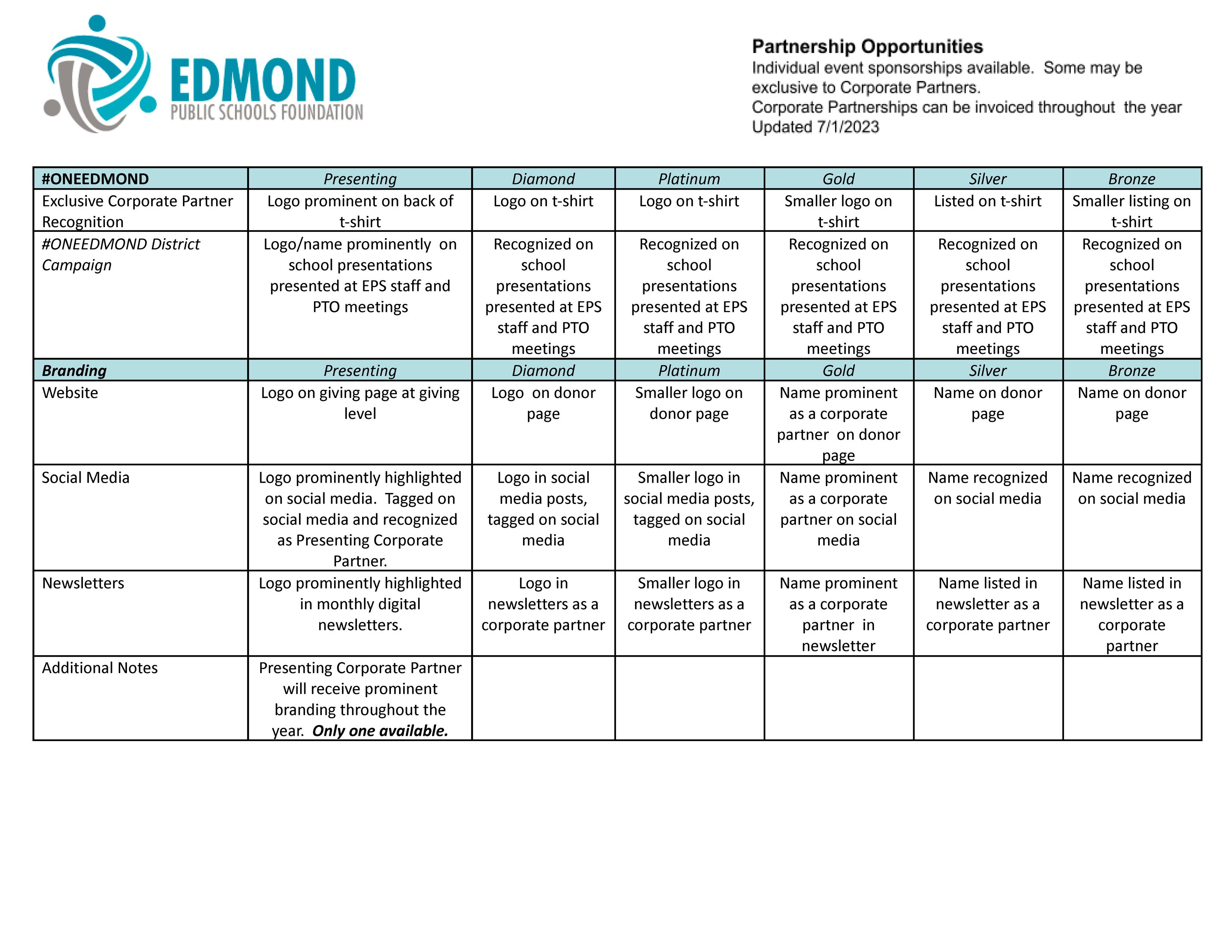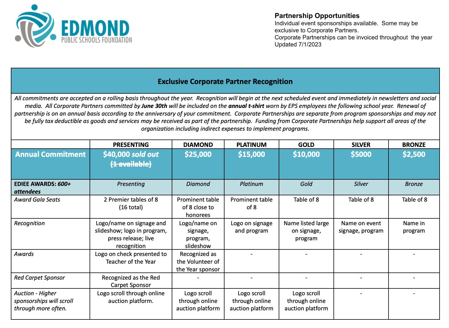 You can make a one-time annual gift and sponsor through a Corporate Partnership, making your commitment to several events at once! We can't wait to see you and tell you more about how your financial support impacts Edmond Public Schools!