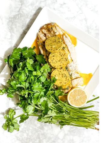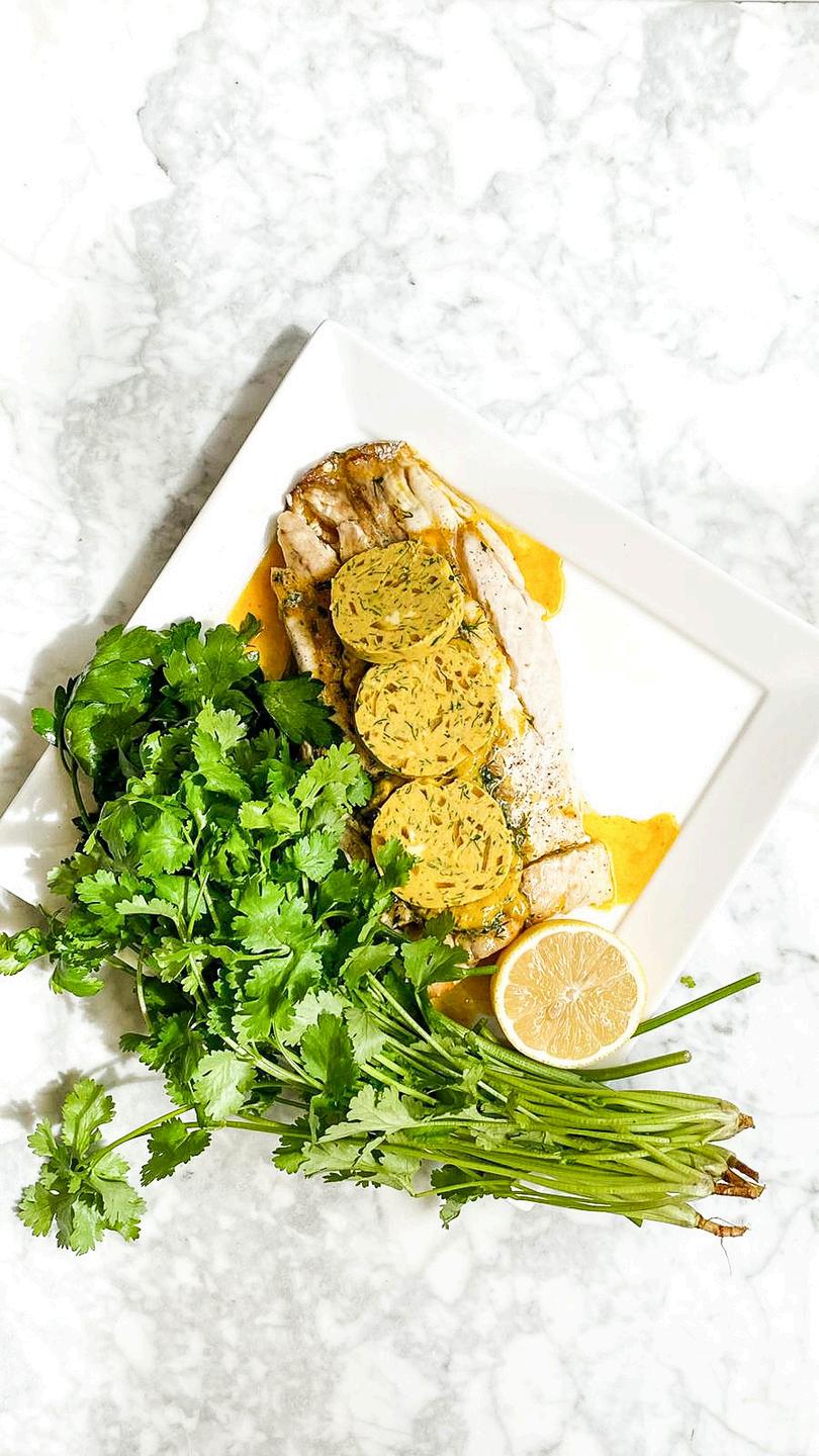Whole side of Humpty doo barramundi fillet with herb whipped butter .