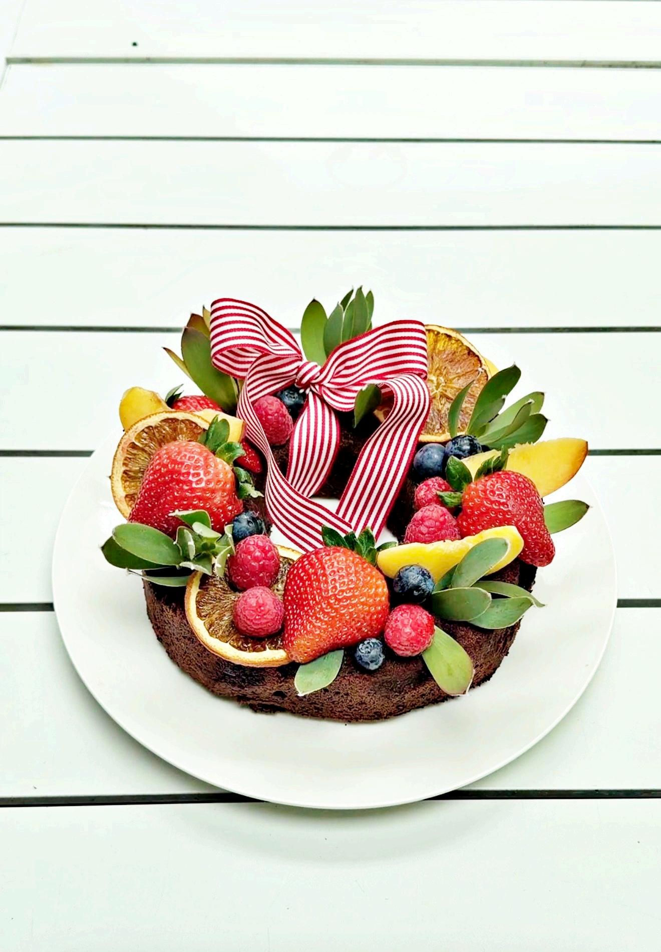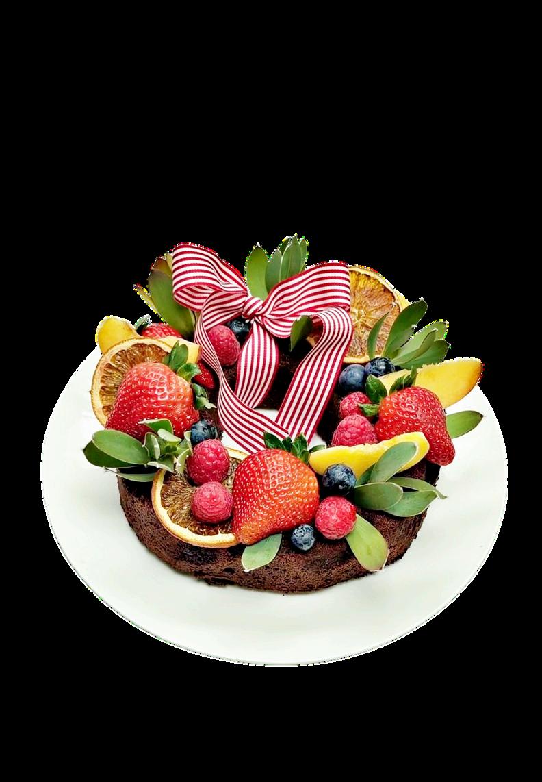 8 inch chocolate Christmas wreath cake topped with chocolate icing dehydrated oranges, fresh fruit. Gift boxed. Serves 8 - 12 people