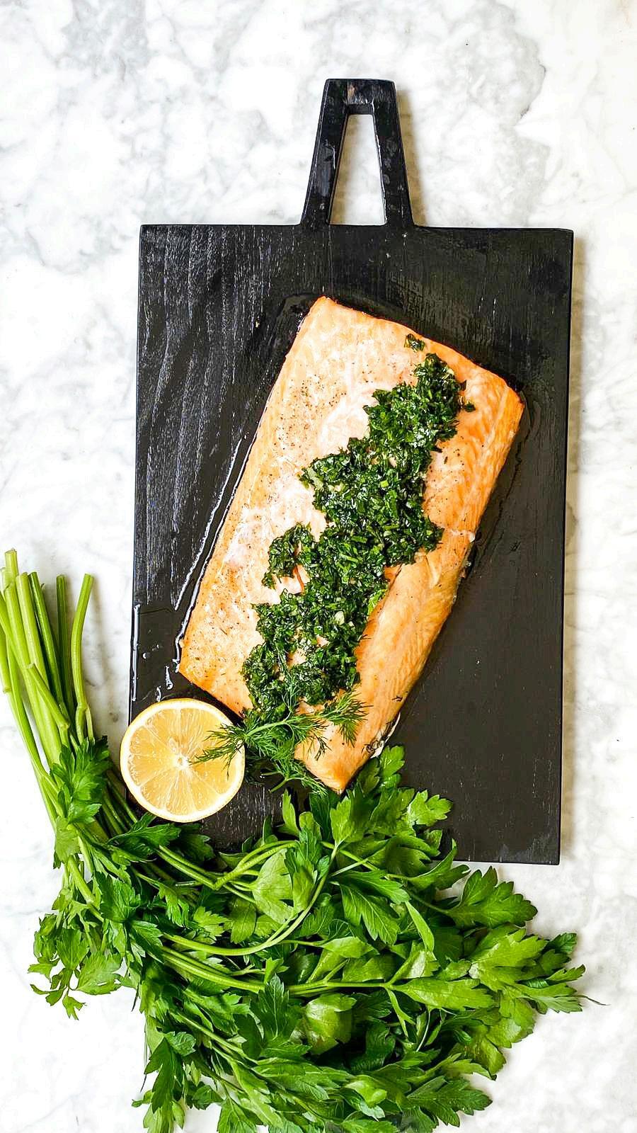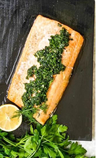 Whole side of Atlantic salmon fillet with Edmonds herb chimichurri.