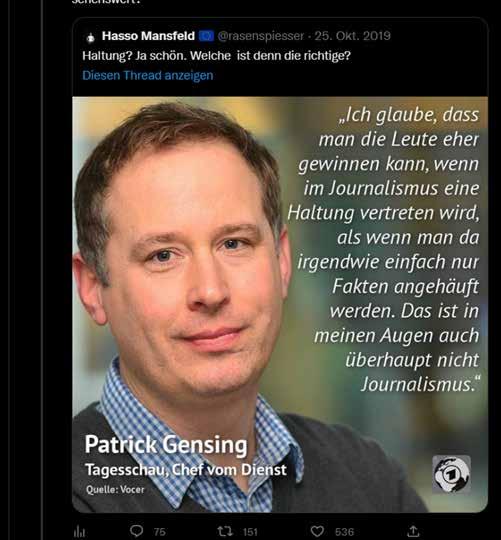 Das Meme, dass Herrn G. so sehr ärgerte, dass er dagegen extra Anwalt K. in den Kampf schickte, zeigt, angelehnt an die Ästehtik deutscher Staatsmedien gestaltet, ein Portrait Gs, das durch ein Zitat ergänzt wird, welches einem seiner Interviews entnommen ist sowie einen Quellnachweis zum erwähnten Zitat-Text. Im Grunde ist es also denkbar harmloser Natur und verbreitet weder “HateSpeech” noch “Fake-News”. Doch offenbar bestand genau darin das Problem von G. Denn im erwähnten Text spricht er sich allem Eindruck nach für eine Form des Journalismus aus, für den Faktentreue womöglich weniger interessant ist, als eine bestimmte “Haltung” zu vertreten: