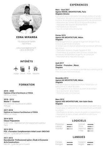 EXPÉRIENCES Mars - Aout 2021 Agence MODAL ARCHITECTURE, Paris Stagiaire (6mois) Implication dans la conception des projets publics et privés : - Réalisation des plans et coupes pour Sorbonne Université, Rectorat de Versailles et des appartements Haussmanniens - Réalisation des fichiers 3D sur le logiciel Rhinocéros - Réalisation des dossiers de présentation - Participation aux réunions - Suivi et compte rendu de chantier