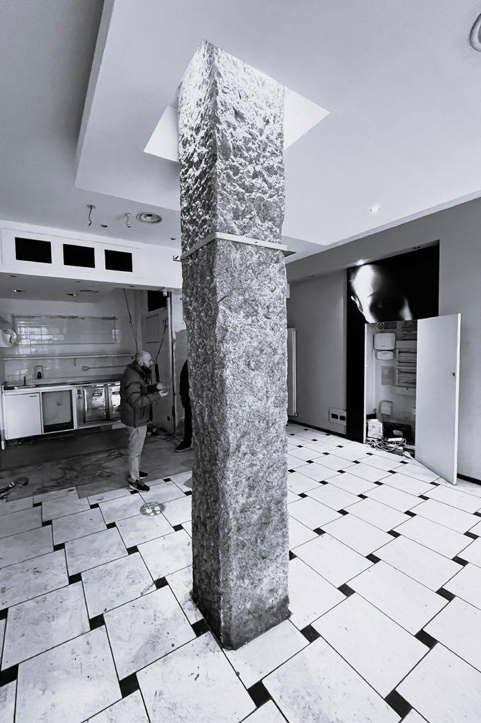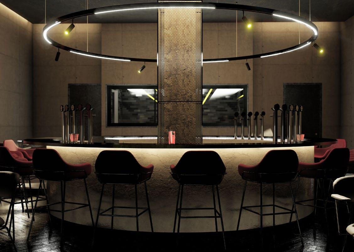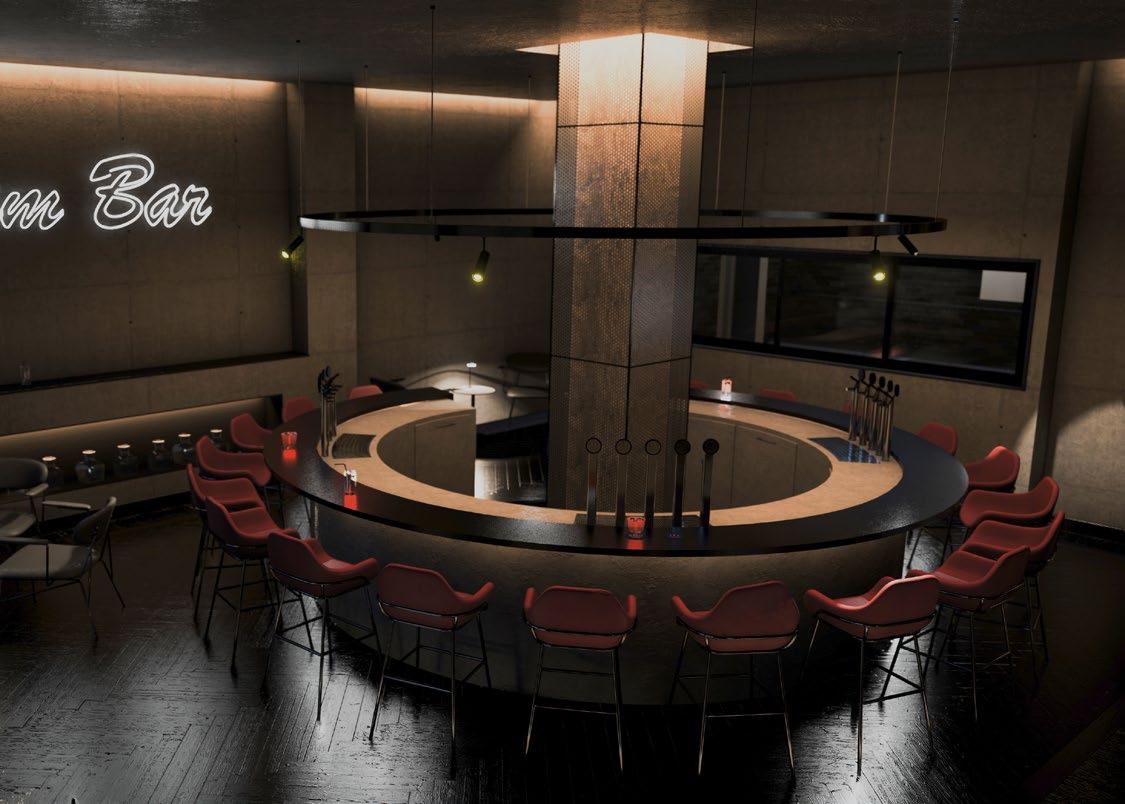 The main focus was to design a nice bar, enhancing the incredible column in the middle of the place: I thought to take advantage of it, since it is a unique piece of stone, making it the centre of the whole place through a very permeable cover made out of perforated metal sheets, trying to allign it with the general mood without really hiding it, and lighting it up with led strips.