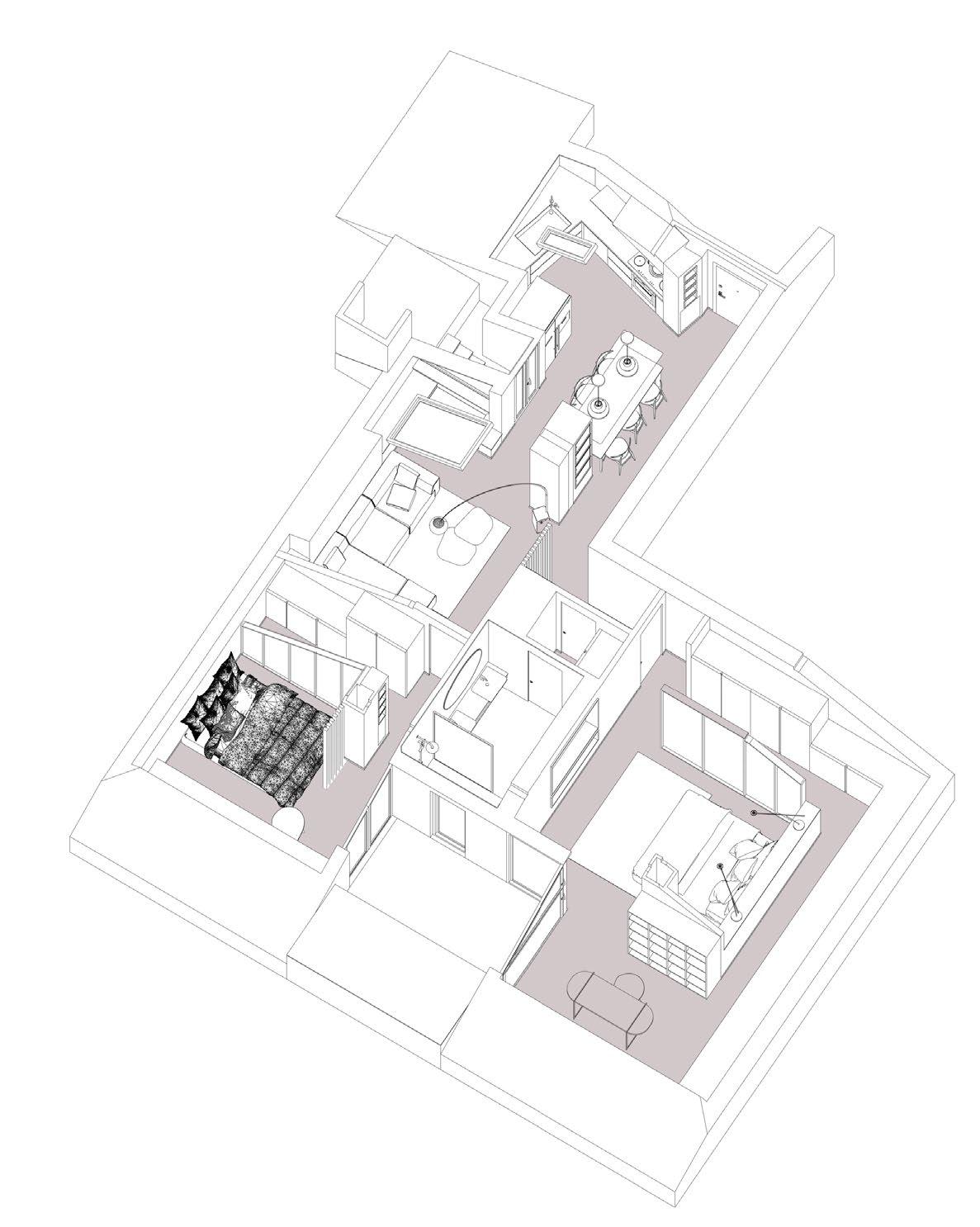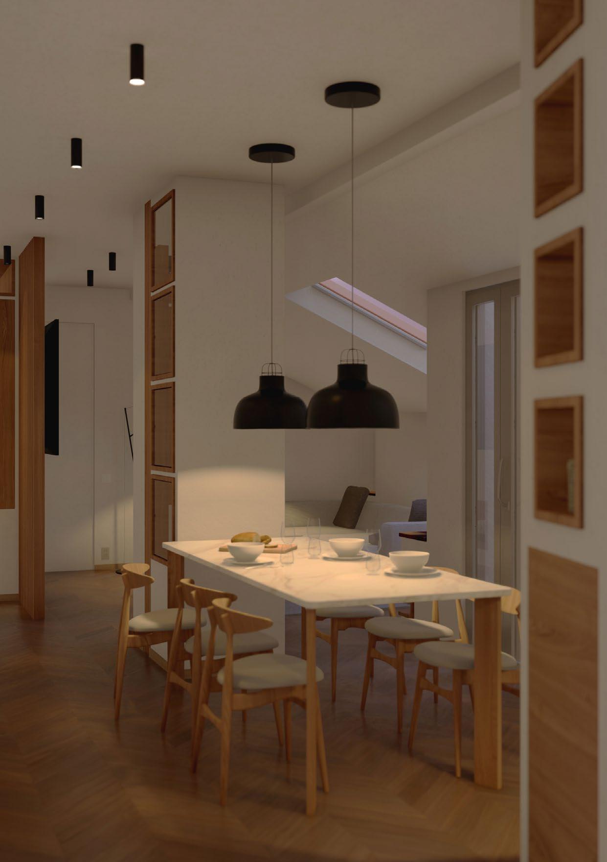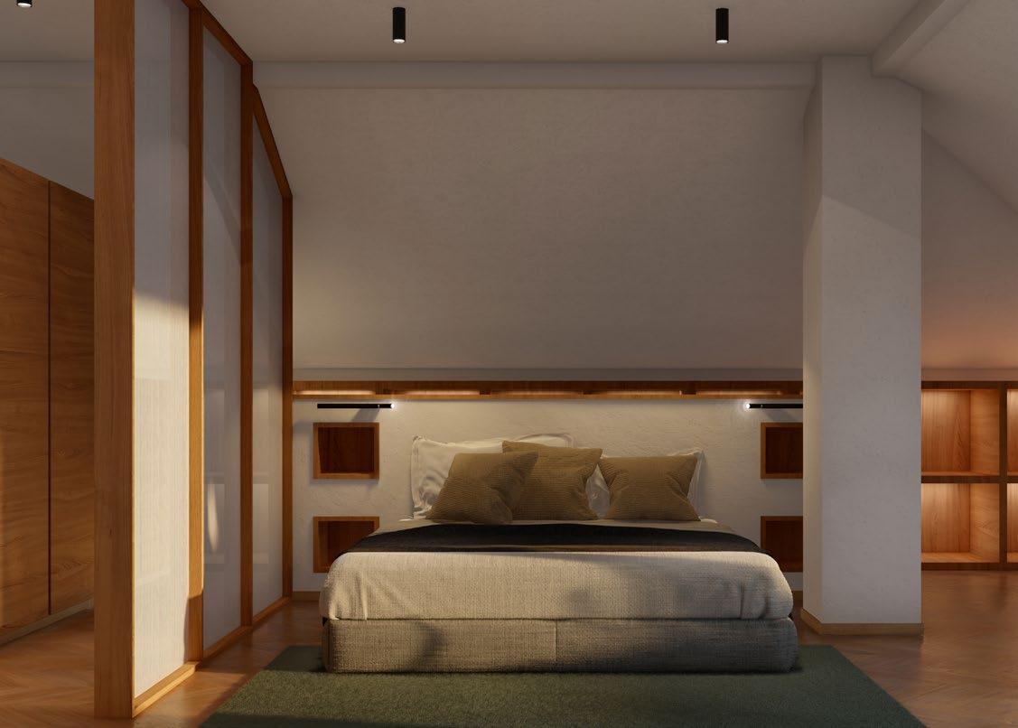 The client wanted to have only one big bathroom, transforming the loggia back into a terrace again, which is supposed to be the link between all the rooms of the sleeping area. SInce the apartment is an attic, I tried to enhance daylight access in the most optimal way, designing semi-permeable walls insipired by japanese Fusuma walls. Also, with the addiction of wood, I tried to give a warm finishing to the whole apartment.