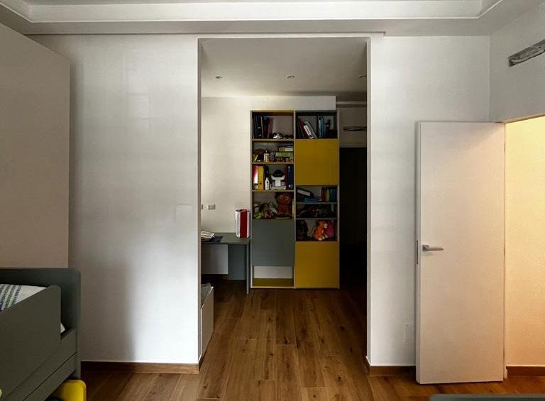 The apartment was in good conditions, but the internal distibution was poor, also there wasn’t any space for the kids to play together and the room’s number didn’t fit family number. The concept was to make the apartment’s structural components themselves the playground, allowing also an easy future internal new subdivision for the growing children.