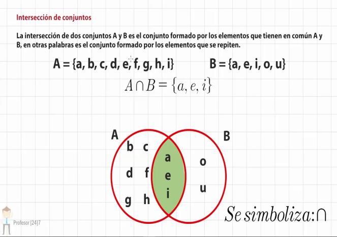 2. Intersección de conjuntos Es una operación que resulta en otro conjunto que contiene los elementos comunes a los conjuntos de partida. Ejemplo