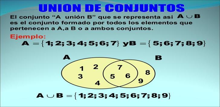 La unión de dos (o más) conjuntos es una operación que resulta en otro conjunto, cuyos elementos son los mismos de los conjuntos iniciales.