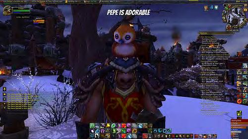 Panning around to the screen: and in…looks like a Guild meet-up in World of Warcraft. Holiday in theme!