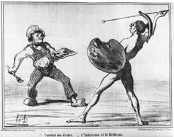 Courbet is kwaad en organiseert een eigen salon: de Salon van het Realisme. Honoré Daumier maakt een spotprent over de strijd tussen de twee stromingen: het idealisme van de academie versus het realisme van Courbet. Op de prent gaan twee kunstenaars met eigen wapens elkaar te lijf 1 . Zij vertegenwoordigen de twee belangrijkste thema’s van dit hoofdstuk. Rechts strijdt de romantiek, oftewel de vlucht uit het alledaagse en links strijdt het realisme, het verslag van het alledaagse