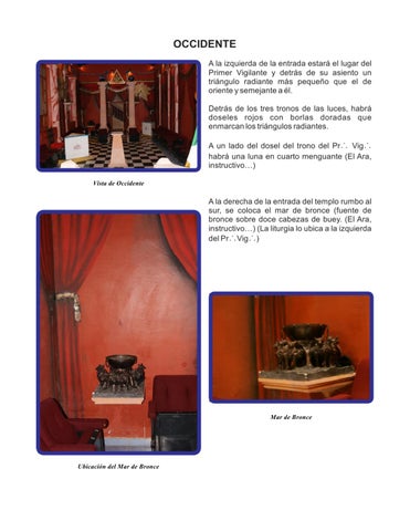 OCCIDENTE A la izquierda de la entrada estará el lugar del Primer Vigilante y detrás de su asiento un triángulo radiante más pequeño que el de oriente y semejante a él. Detrás de los tres tronos de las luces, habrá doseles rojos con borlas doradas que enmarcan los triángulos radiantes. A un lado del dosel del trono del Pr∴ Vig∴ habrá una luna en cuarto menguante (El Ara, instructivo…) Vista de Occidente