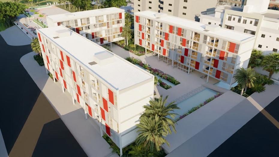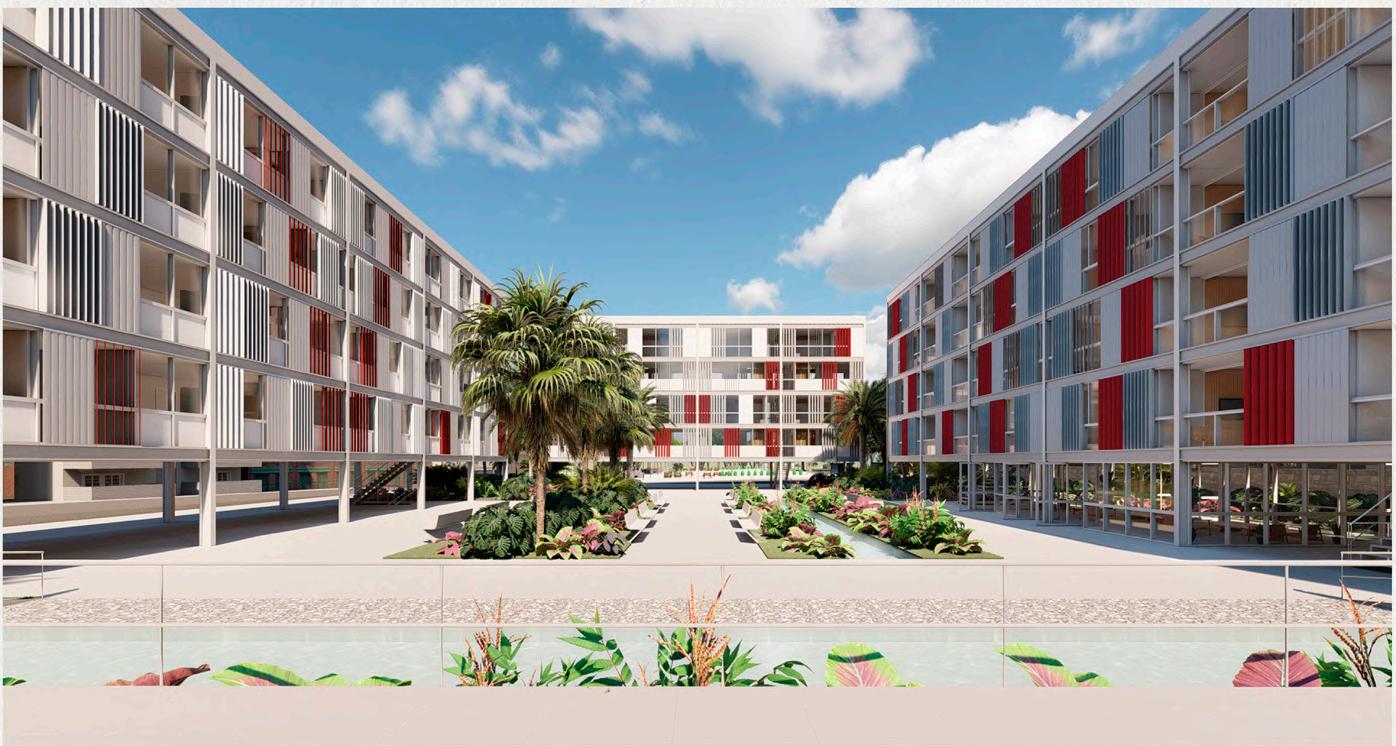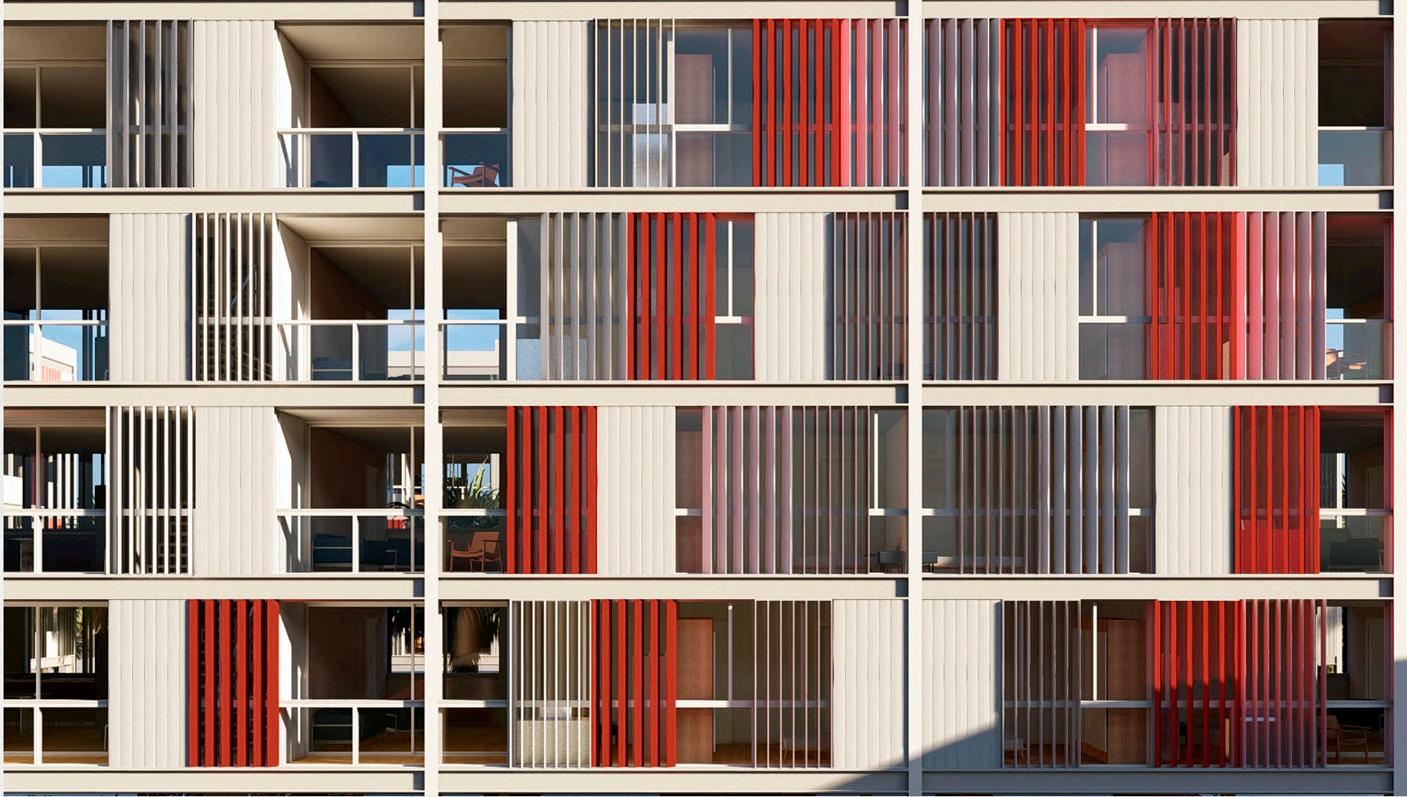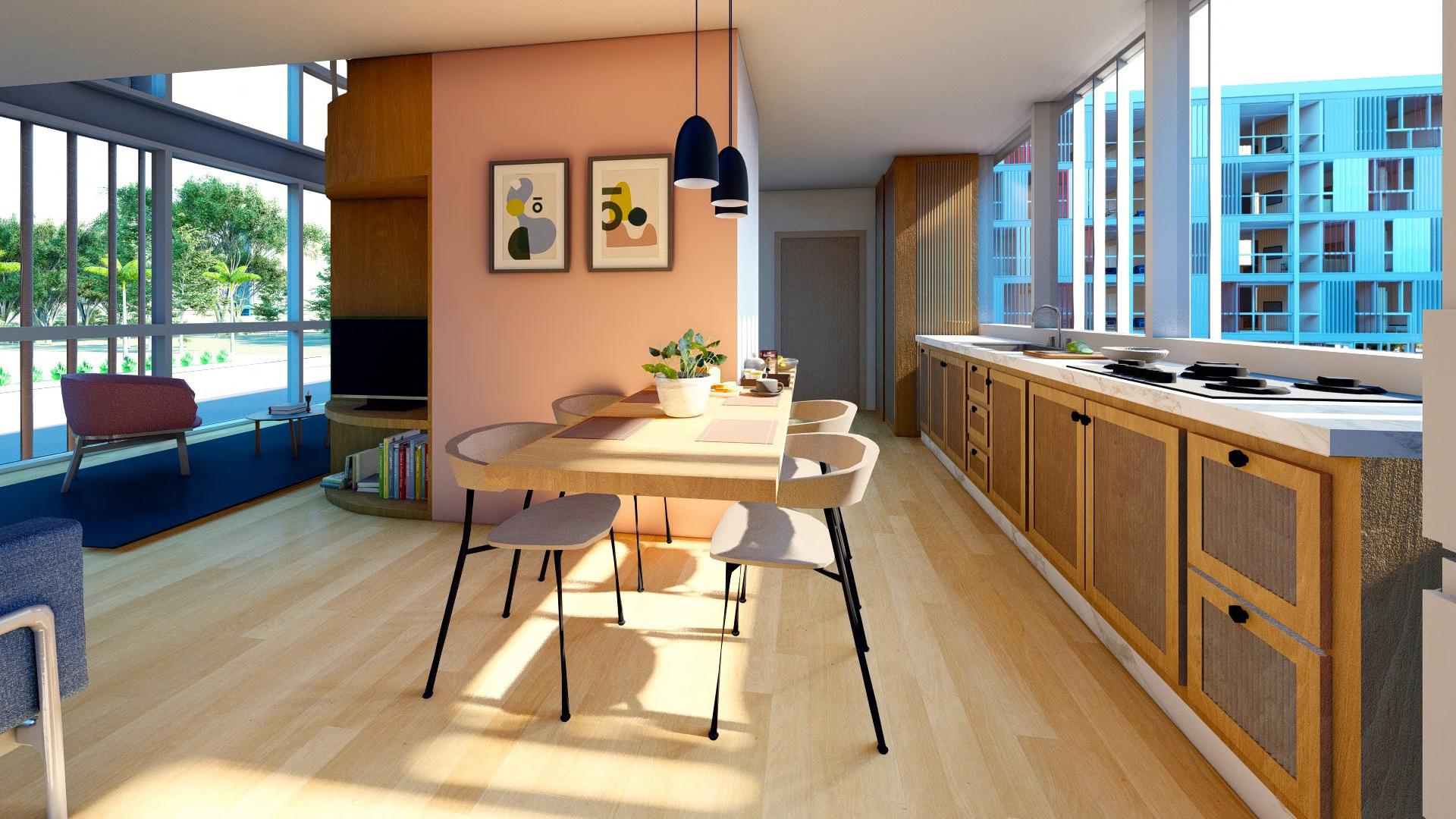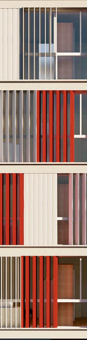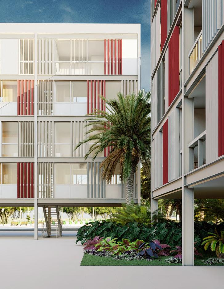 2020 _ O objetivo do exercício foi elaborar o projeto de um conjunto habitacional de média densidade executado com elementos modulares pré-fabricados, resultando em três edificações de térreo + quatro andares, divididas em duas tipologias: