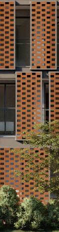 Os painéis cobogó são constituídos de uma paginação de brick breeze (bloco cerâmico desenvolvido pela empresa Manufatti Revestimentos), presos por cabos de aço clipados à estrutura – um frame de metalon que, por vez, é preso à alma das vigas do edifício