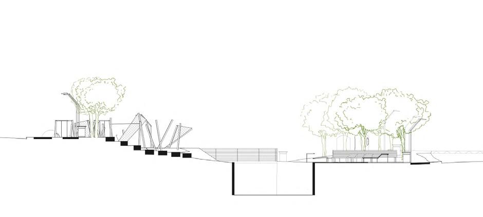 Área 3 _ Seguindo pelo trajeto encontra-se a esquina da extremidade da atuação do projeto, pensada como uma das entradas para o parque e, por isso, projetada para ser um local convidativo e de contemplação, alicerçado pela requalificação de intervenções passadas na topografia e com os mesmos elementos de tablado presentes nas outras intervenções.