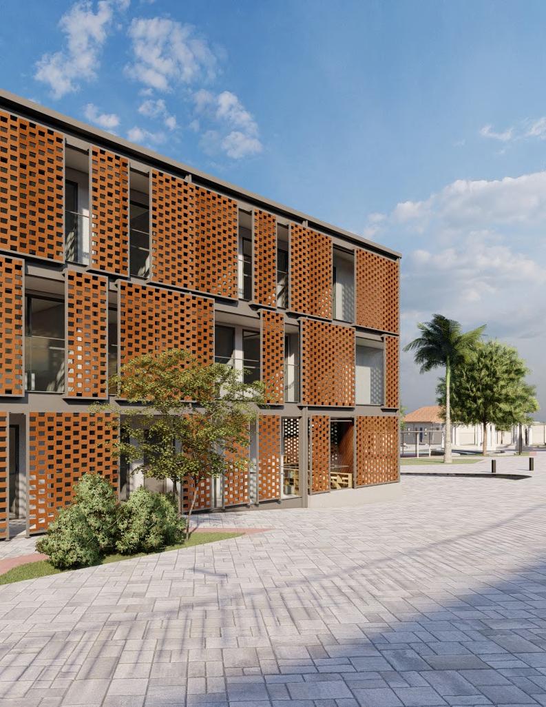 Nesse sentido, o edifício utiliza como base a volumetria e implantação da antiga construção, com o térreo posicionado no limite do lote e com um chanfro na esquina. A materialidade do prédio buscou conectar-se com os elementos presentes na antiga estação e no hotel, como os tijolos de barro e o aço.