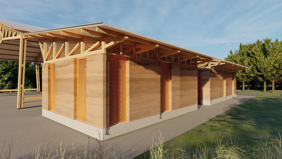 2021 _ Visando aprofundar a compreensão sobre sistemas construtivos, princípios estruturais, dimensionamento e materiais de componentes construtivos na disciplina Tecnologias da Construção, desenvolveu-se um galpão estruturado em Madeira Laminada Colada (MLC) e um bloco adminstrativo em Taipa de Pilão.