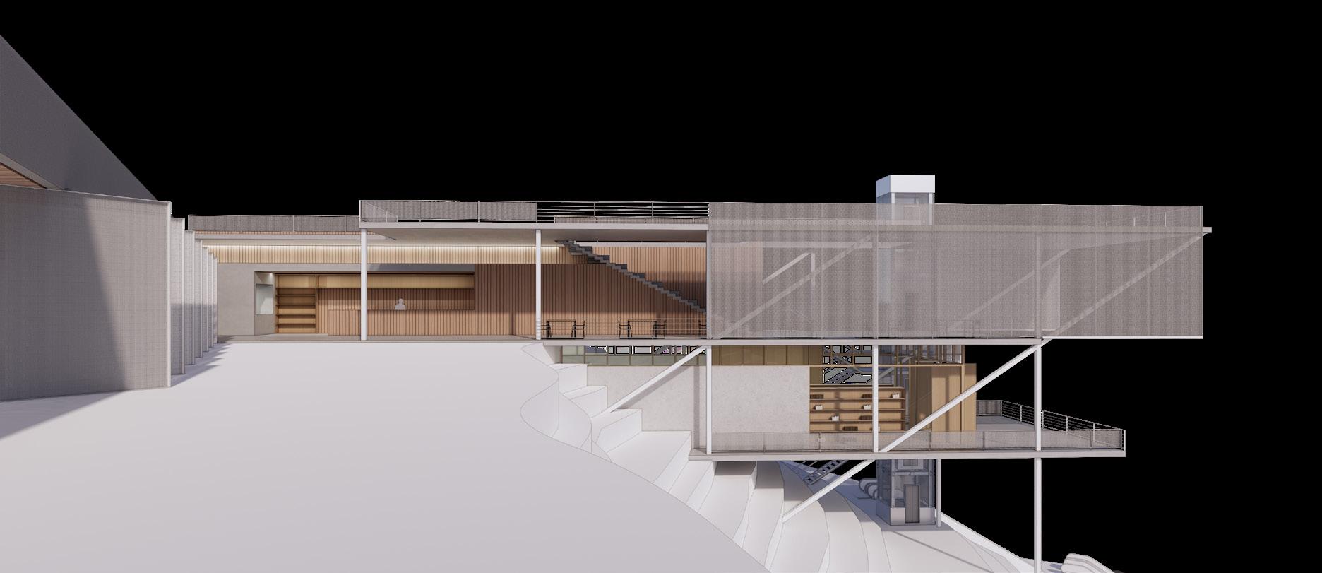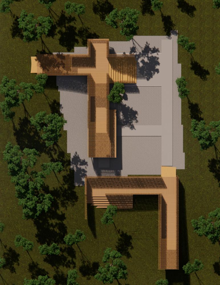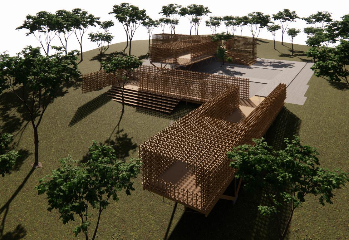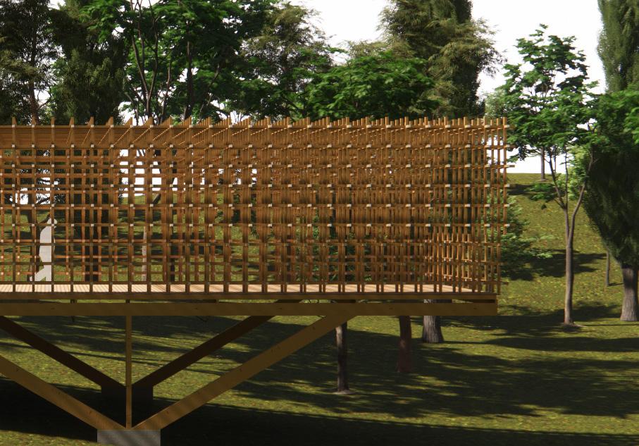 O projeto busca explorar as características plásticas e estruturais da madeira. Os dois corpos principais que se estendem pelo terreno delimitam e criam espaços de circulação e estadia para os usuários desse percurso. Os planos elevados pelos pilares de madeira parecem flutuar pelo declive e criam espaços de acolhimento e estadia conforme interagem com o as diferentes alturas e sinuosidades do terreno. A planta busca ocupar o terreno de forma simples, explorando os usos possíveis para os vazios e como se apropriar deles.