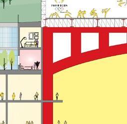 Le Grand Pont is both a landmark and cultural hub, defined by its seven striking red bridge frames symbolizing connection and the Olympic spirit. Within these frames, commercial spaces shops, cafés, and restaurants—face the Seine, creating a vibrant riverside experience. Beyond commerce, the bridge also serves as an evolving open-air art gallery, with its dynamic roof showcasing murals and street art by local and international artists. Public participation through workshops and open calls strengthens community ownership. By merging commerce, architecture, and art, Le Grand Pont becomes a lively desti- nation that fosters connection, creativity, and a unique view of Paris.