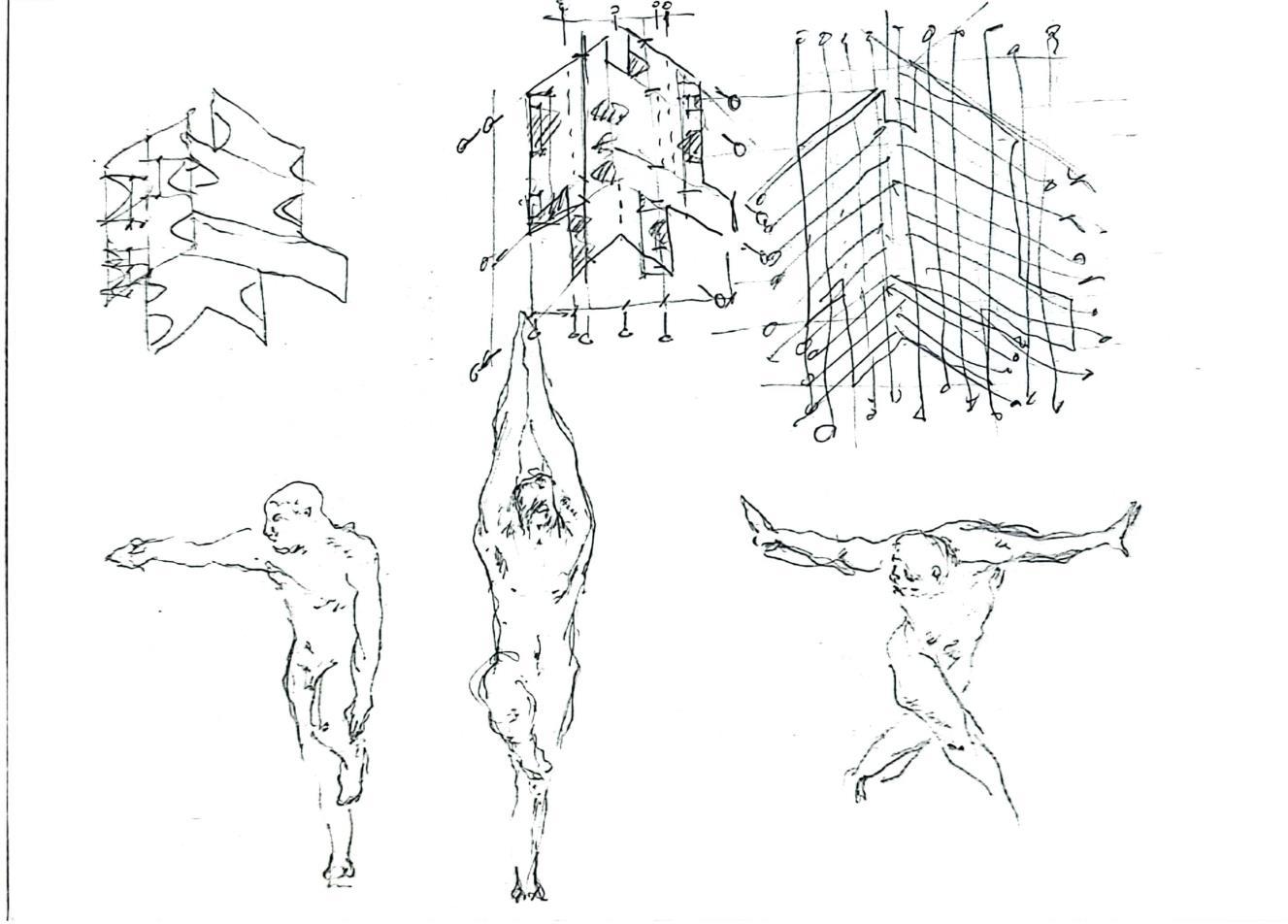 (42) Sistemasubordinadoalaestructuraespacialdetetraedros.El elementoesunplanoperforadodeaceroqueocupalascarasseñaladasdelostetraedros,describiendoentretodasunarcorígidotridimensionaldecatenariahacialosapoyos.