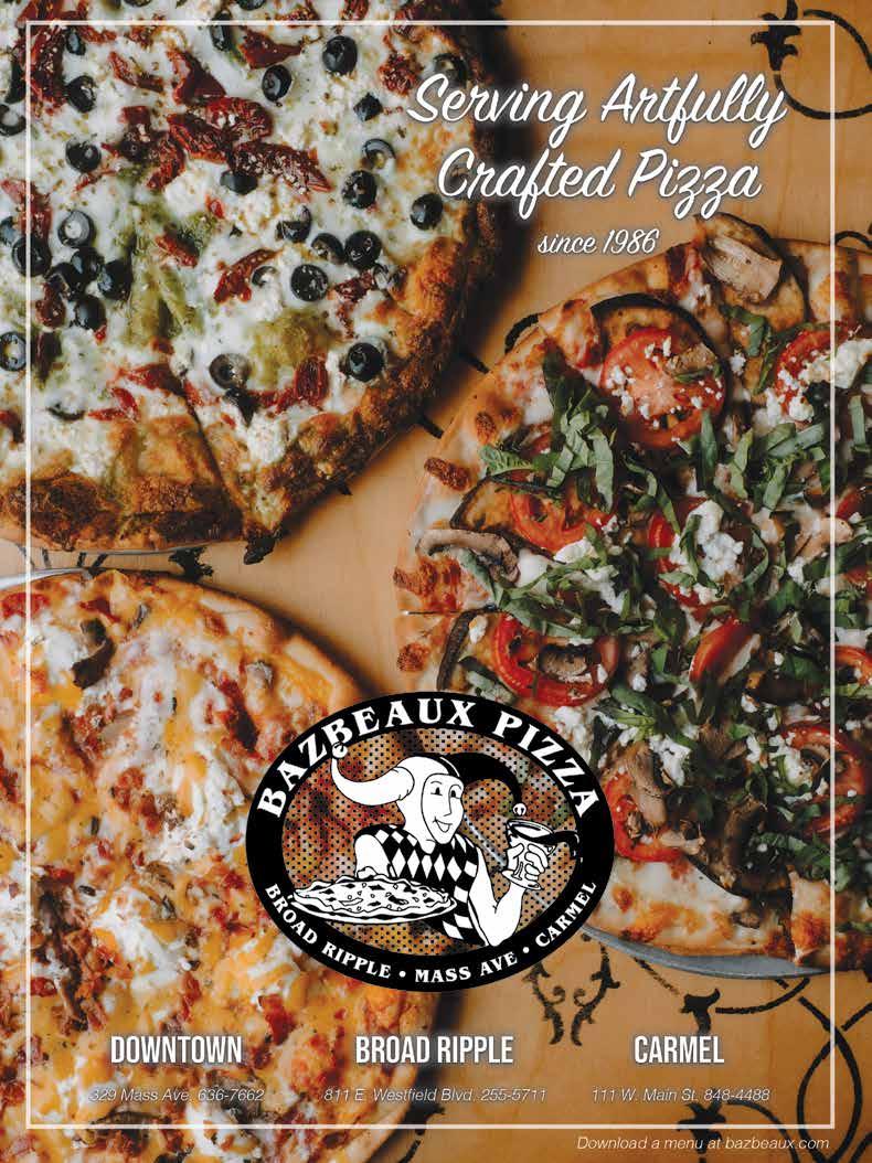 Since opening in 1986, Bazbeaux Pizza has been a true Indianapolis original— an independent pizzeria that helped shape the city’s pizza scene with its inventive combinations and unwavering focus on quality. With locations in Broad Ripple, Mass Ave and Carmel’s Arts & Design District, it’s a destination for both casual weeknights and special outings.