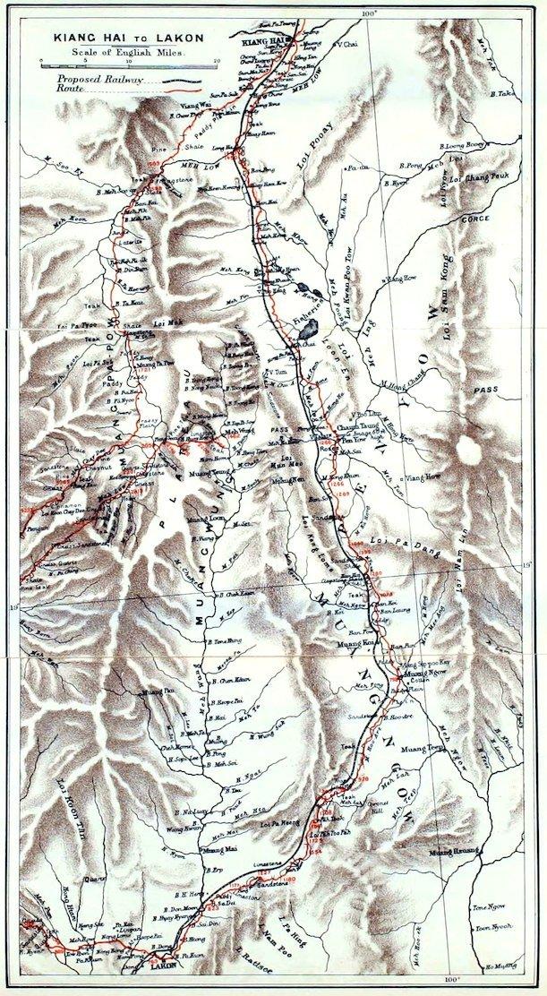 In the account of his journey from Kiang Hsen to Kiang Hai in February 1887, Mr Archer, our consul at Zimmé, brings out the importance of the trade converging at Kiang Hai, and passing over the portion of the route we had traversed to the Burmese Shan States and China, along which we propose the railway to China should be carried. He states that “the road from Ban Me Khi (Meh Kee) to Chienghai (Kiang Hai) is probably the greatest and most important thoroughfare in the whole of the north of Siam, and the traffic here is comparatively very considerable: in the course of a day I passed many caravans of pack-animals, some consisting of a long file of over a hundred bullocks. The greater proportion of the traders were Ngios (Burmese Shans) from Chiengtung (Kiang Tung), who came to purchase goods in Chiengmai and Lakhon (Zimmé and Lakon), chiefly cotton goods, iron, and salt. Very few of the Laos (Ping Shans) seem to venture into Chiengtung territory for trading purposes; in fact, it is apparent that the Laos cannot compete with the Ngio and Toungthoo traders and pedlars. This, again, is the route taken by the Ho, or Yunnanese traders, on their yearly trading expeditions to Moulmein (Maulmain).”