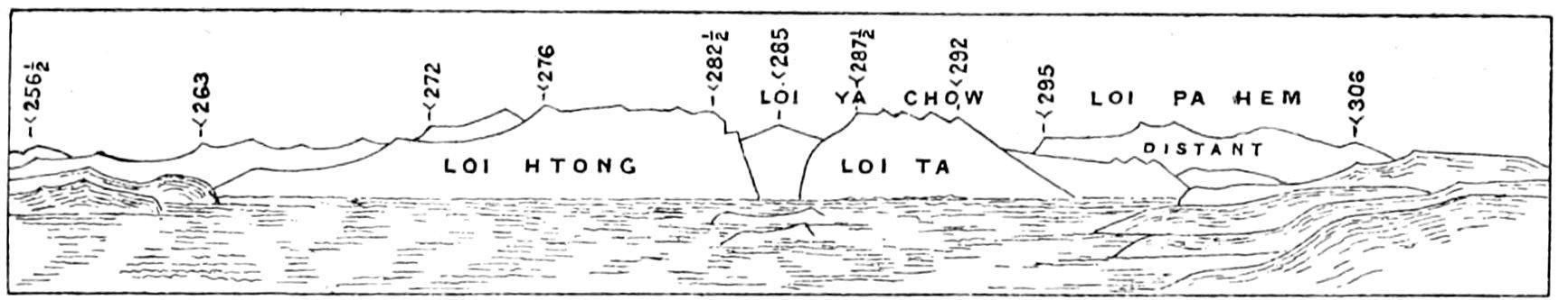 The day before we left Kiang Hsen, I took a walk to the pagoda on Loi Saun-ka-tee, the hill to the north of the city, in order to sketch the hills to the west of the plain, and, as far as possible, fix their position. The air was clear, and I got a splendid view. Loi Htong, Loi Ya Tow, and Loi Ta, which I had previously sketched on entering the Kiang Hsen plain, now lay a little to the north of west, at a distance of about seventeen miles. Farther to the north, Loi Pa Hem loomed up in the distance, and seemed not to belong to the same system of hills: this hill was passed by M‘Leod when on his way to Kiang Tung in 1837. The great plain we were looking at, in which a few hillocks outcropped, extended to the foot of the mountains, but its northern and southern extensions were hidden by the low hills on which we were standing, and the hillocks which we had skirted on our way to the city.