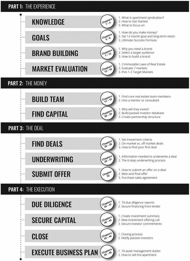 This book does not just tell you what to do. It tells you how to do it. It includes step-by-step processes for what to do, as well as systems, examples from my investment experience and guided exercises for you to complete to learn how to go from having no experience, no money and no deals to completing your first apartment syndication.