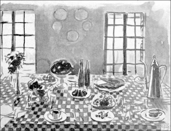 LA NAPPE ÉTALAIT LES FAIENCES PEINTES ET LA VAISSELLE D’ÉTAIN (P. 96).