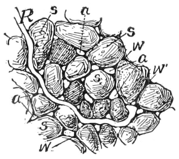 FIG. 46.—ROOT-HAIR, much enlarged, in contact with the soil particles (s). Airspaces at a; water-films on the particles, as at w.