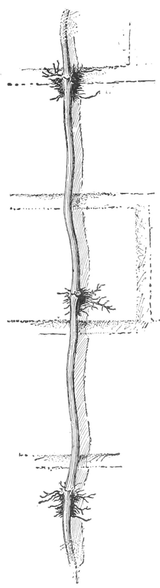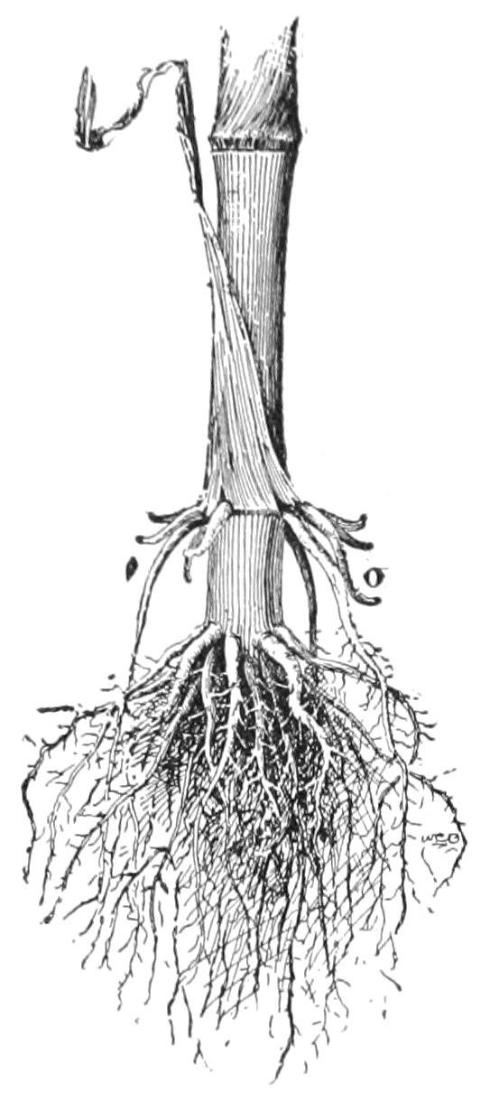 Adventitious Roots.—Sometimes roots grow from the stem or other unusual places as the result of some accident to the plant, being located without known method or law. They are called adventitious (chance) roots. Cuttings of the stems of roses, figs, geraniums, and other plants, when planted, send out adventitious roots and form new plants. The ordinary roots, or soil roots, are of course not classed as adventitious roots. The adventitious roots arise on occasion, and not as a normal or regular course in the growth of the plant.