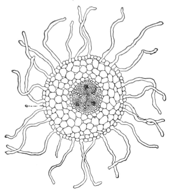 FIG. 45.—CROSS-SECTION OF ROOT, enlarged, showing root-hairs.
