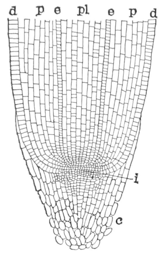 FIG. 47. GROWING POINT OF ROOT OF INDIAN CORN. d, d, cells which will form the epidermis; p, p, cells that will form bark; e, e, endodermis; pl, cells which will form the axis cylinder; i, initial group of cells, or growing point proper; c, root-cap