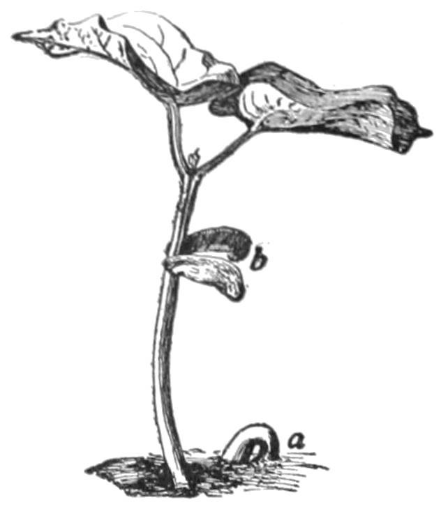 Germination of Bean. The common bean, as we have seen (Fig. 15), has cotyledons that occupy all the space inside the seed-coats. When the hypocotyl, or elongated caulicle, emerges, the plumule leaves have begun to enlarge, and to unfold (Fig. 18). The hypocotyl elongates rapidly. One end of it is held by the roots. The other is held by the seed-coats in the soil. It therefore takes the form of a loop, and the central part of the loop “comes up” first (a, Fig. 19). Presently the cotyledons come out of the seed-coats, and the plant straightens and the cotyledons expand. These cotyledons, or “halves of the bean,” persist for some time (b, Fig. 19). They often become green and probably perform some function of foliage. Because of its large size, the Lima bean shows all these parts well.