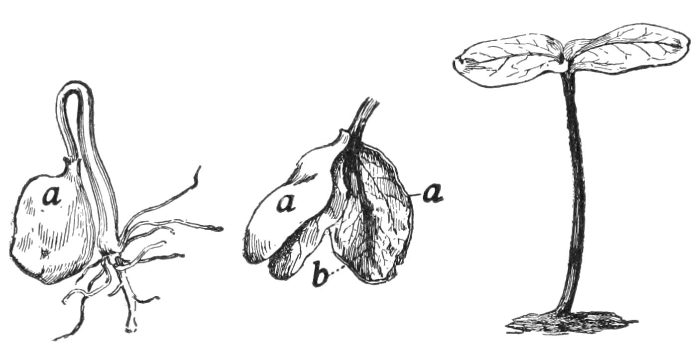 Germination of Castor Bean.—In the castor bean the hilum and micropyle are at the smaller end (Fig. 20). The bean “comes up” with a loop, which indicates that the hypocotyl greatly elongates. On examining germinating seed, however, it will be found that the cotyledons are contained inside a fleshy body, or sac (a, Fig. 21). This sac is the endosperm. Against its inner surface the thin, veiny cotyledons are very closely pressed, absorbing its substance (Fig. 22). The cotyledons increase in size as they reach the air (Fig. 23), and become functional leaves.