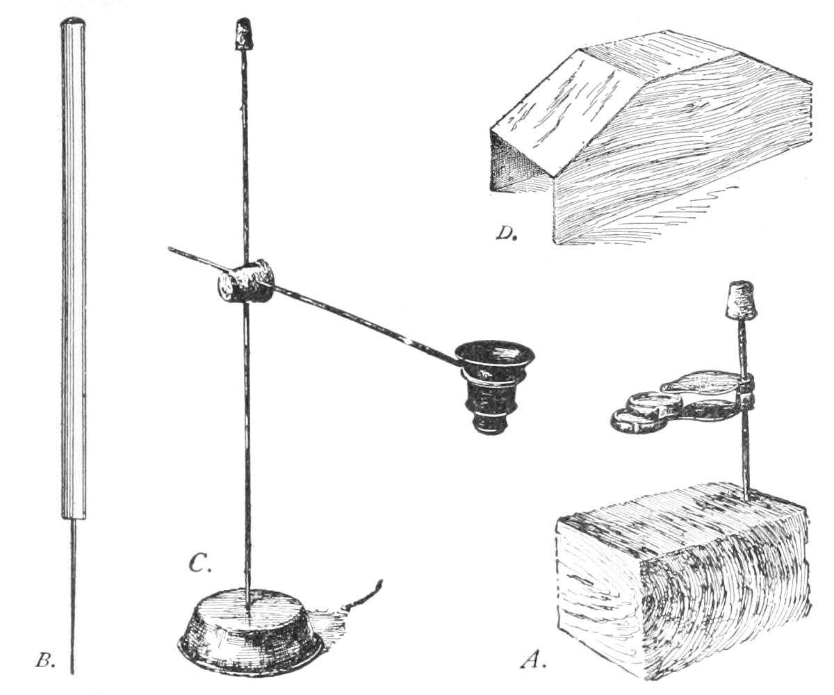 For dissecting, one needs a lens for the examination of the smaller parts of plants and animals. It is best to have the lens mounted on a frame, so that the pupil has both hands free for pulling the part in pieces. An ordinary pocket lens may be mounted on a wire in a block as in Fig. A. A cork is slipped on the top of the wire to avoid injury to the face. The pupil should be provided with two dissecting needles (Fig. B), made by securing an ordinary needle in a pencil-like stick. Another convenient arrangement is shown in Fig. C. A small tin dish is used for the base. Into this a stiff wire standard is soldered. The dish is filled with solder to make it heavy and firm. Into a cork slipped on the standard, a cross wire is inserted, holding on the end a jeweller’s glass. The lens can be moved up and down and sidewise. This outfit can be made for about seventy-five cents. Fig. D shows a convenient hand-rest or dissecting-stand to be used under this lens. It may be 16 in. long, 4 in. high, and 4 or 5 in. broad.