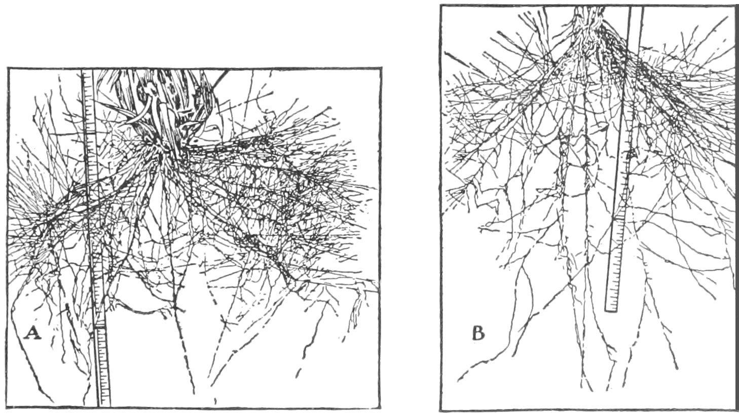 FIG. 39.—ROOTS OF BARLEY AT A AND CORN AT B.