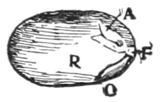 PARTS OF THE BEAN. R, cotyledon; O, caulicle; A, plumule; F, first node.