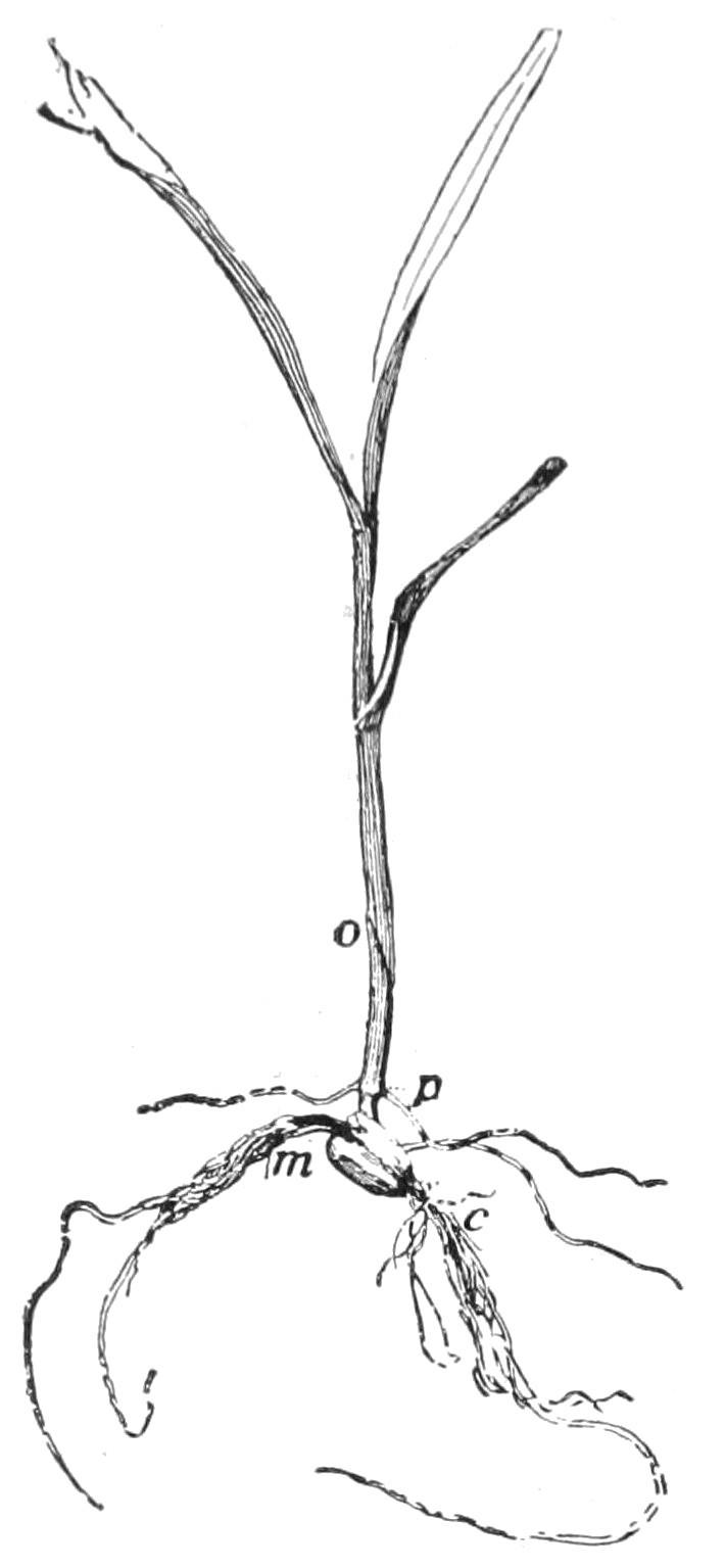 FIG. 28. GERMINATION IS COMPLETE. p, top of epicotyl; o, plumule-leaf; m, roots; c, lower roots.