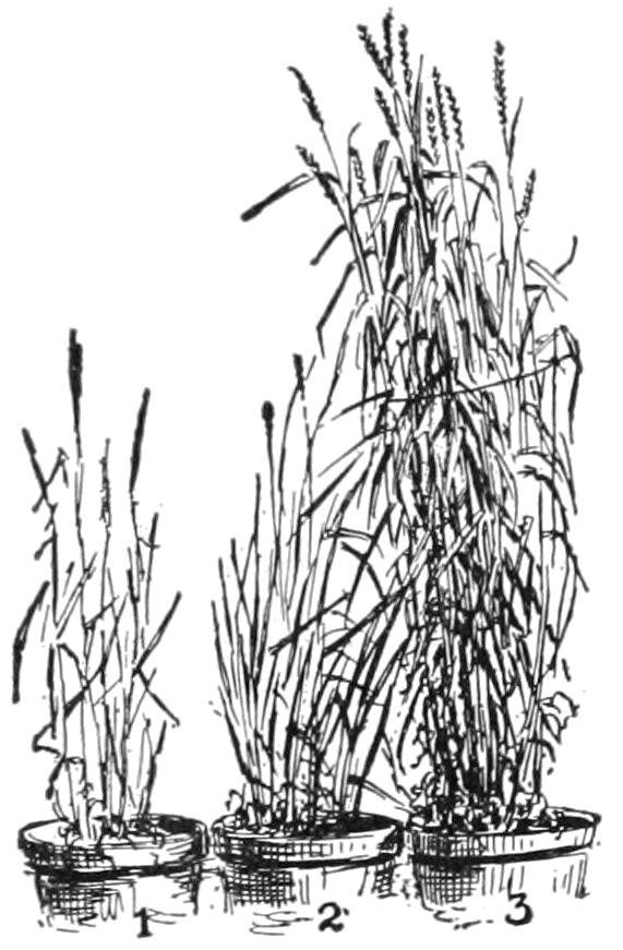 FIG. 40. WHEAT GROWING UNDER DIFFERENT SOIL TREATMENTS. Soil deficient in nitrogen; commercial nitrogen applied to pot 3 (on right).