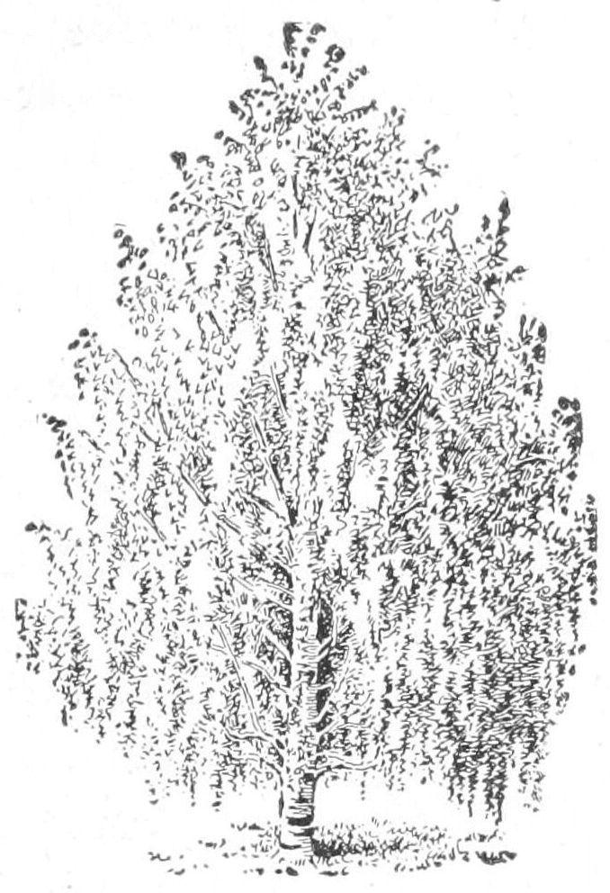 Woody or ligneous plants usually live longer than herbs. Those that remain low and produce several or many similar shoots from the base are called shrubs, as lilac, rose, elder, osier (Fig. 13). Low and thick shrubs are bushes. Plants that produce one main trunk and a more or less elevated head are trees (Fig. 14). All shrubs and trees are perennial.