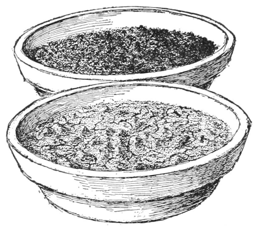 FIG. 43. TWO KINDS OF SOIL THAT HAVE BEEN WET AND THEN DRIED. The loamy soil above remains loose and capable of growing plants; the clay soil below has baked and cracked.