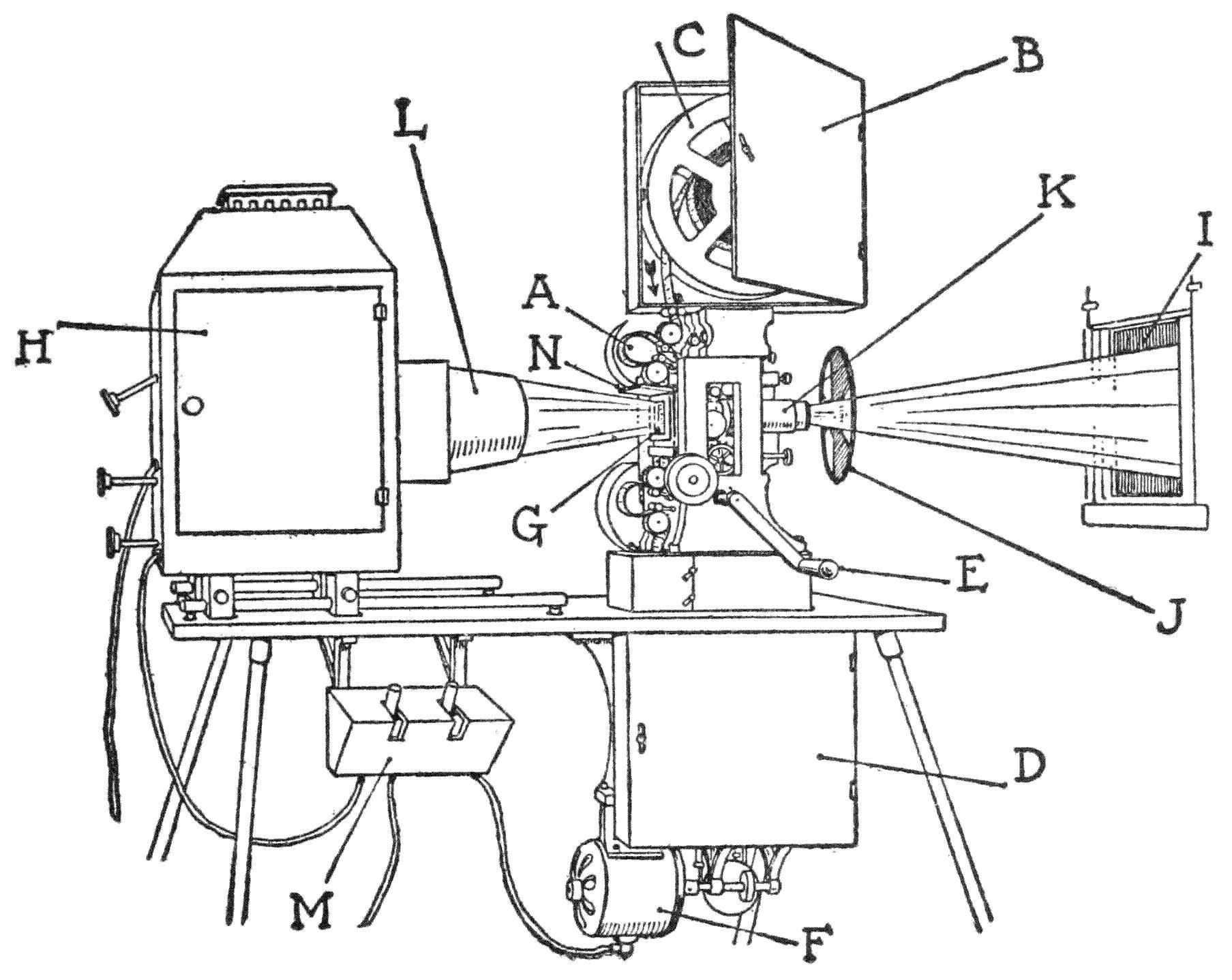 A. Film. B. Upper magazine. C. Feed reel. D. Lower magazine, containing the take-up reel. E. Crank to operate mechanism by hand. F . Motor. G. Where the film stops intermittently to be projected. H. Lamp-house. I. Port, or window in the fireproof projection booth. J. Rotating shutter. K. Lens. L. Condenser. M. Switches. N. Fire shutter; automatically drops when the film stops or goes too slowly.