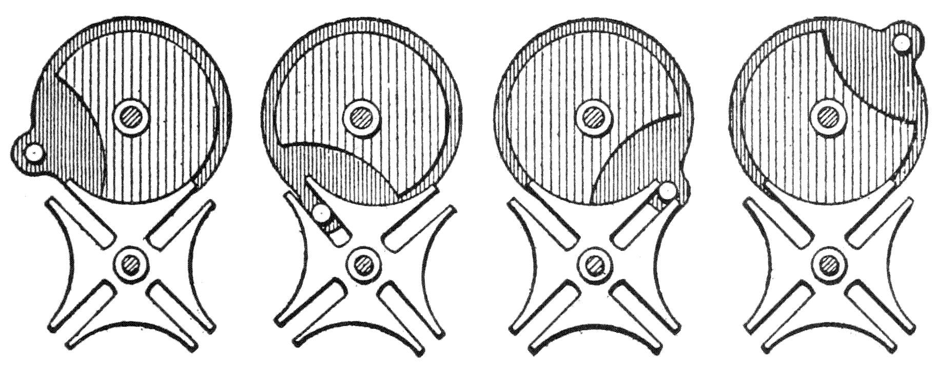 FOUR PHASES OF THE ACTION OF THE INTERMITTENT GEARING KNOWN AS THE GENEVA MOVEMENT.