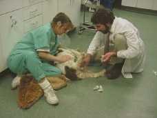 Following the recommendations, I anesthetized Sonic with an inhalant anesthetic. We placed him in the large clear mask. The anesthetic was slowly delivered with every breath. Finally Sonic relaxed enough so I was able to have a more thorough look. Once Sonic’s leg was exposed, the problem was quite obvious. The rags that Sonic used as a nest had tattered edges with loose strings. One of these strings had wrapped tightly around his foot and stopped the circulation. The foot had turned dark and was oozing. All mammals rely on circulation to maintain their bodies. What happened to Sonic’s foot when the blood supply was stopped?