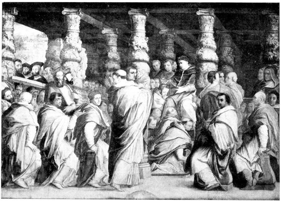 A favourable specimen of Vasari’s decorative painting is the fresco in the Palazzo Vecchio at Florence, given on Plate I. It represents Leo X surrounded by his Cardinals, and introduces portraits of famous men of the day. For instance, on the left above the balustrade in the upper part of the fresco against the opening, will be observed four heads of personages outside the conclave. That on the right is of Leonardo da Vinci and the one on the left Michelangelo’s, while the two men with covered heads who intervene are Giuliano de’ Medici, Duc de Nemours, and his nephew Lorenzo de’ Medici, Duca d’ Urbino, the originals of Michelangelo’s world-famous statues on the Medici tombs, that are of course treated in a wholly ideal fashion. It will be observed that among the foreground figures the heads of the second from the left and the second from the right are rendered with much more force and character than the rest. They are of Cardinal Giulio de’ Medici afterwards Clement VII, and Cardinal de’ Rossi, and Vasari has saved himself trouble by boldly annexing them, and with them the bust of the Pope, from Raphael’s Portrait of Leo X, of which, as he tells us elsewhere, he had at one time made a copy.