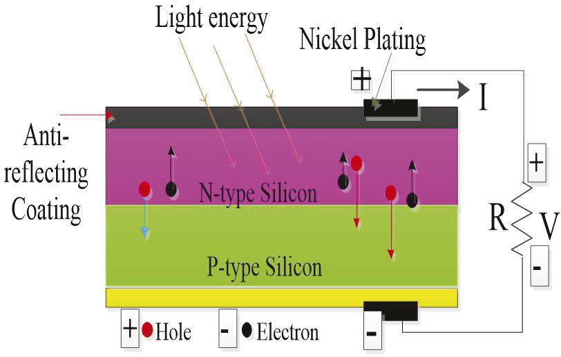 A phenomenon referred to as the photovoltaic effect is responsible for solar cells’ ability to convert sunshine into usable electricity. Solar cells are also known as photovoltaic cells. The production of energy by specific materials, such as silicon, when they are subjected to the action of sunshine is referred to as the photovoltaic effect. Silicon is a type of substance known as a semiconductor, and a solar cell is made up of layers of silicon. The upper layer of the solar cell is made up of a very thin layer of phosphorus-doped silicon, as shown in Figure 2.2, which has an overabundance of electrons. This layer is what makes up the solar cell. The base layer is composed of a more substantial layer of boron-doped silicon, which has a lower number of electrons than the other layers. When light from the sun strikes a solar cell, photons from the light are taken in by the silicon crystals that are located in the solar cell’s upper layer. Because of this, electrons in the silicon are dislodged from their atomic bonds, which results in a movement of electrons between the upper and lower levels of the solar cell. The movement of electrons results in the production of a direct current (DC), which is then routed to a converter, where it is changed into an alternating current (AC), which is the type of electricity that can be used to power buildings like houses and businesses. The holes and electron production on respective materials as shown in Figure 2.2 [38], [39].